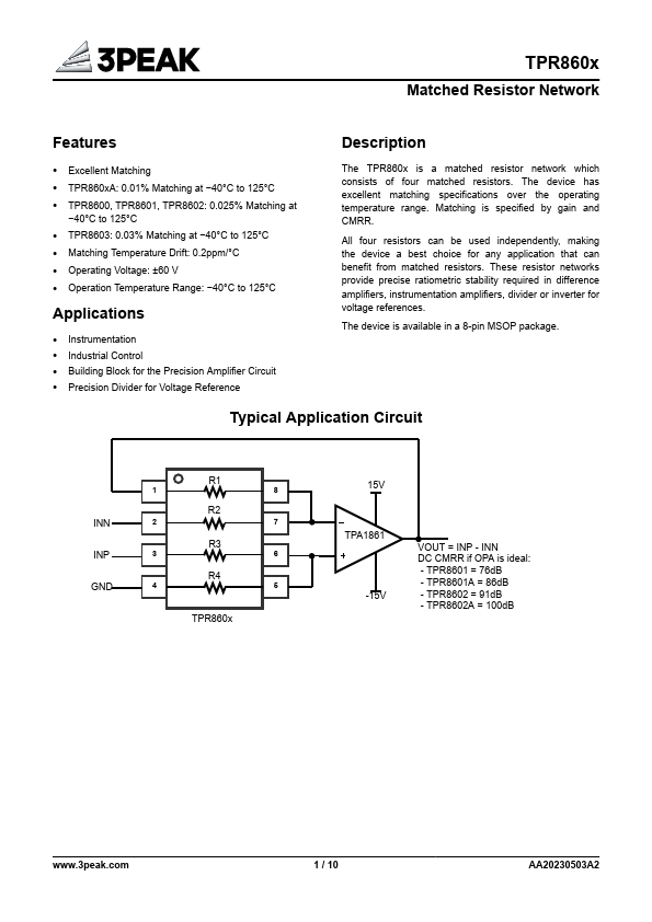 Excellent Matching TPR860xA: 0.01% Matching at −40°C to 125°C TPR8600, TPR8601, TPR8602: 0.025% Matching at −40°C to 125°C TPR8603:.