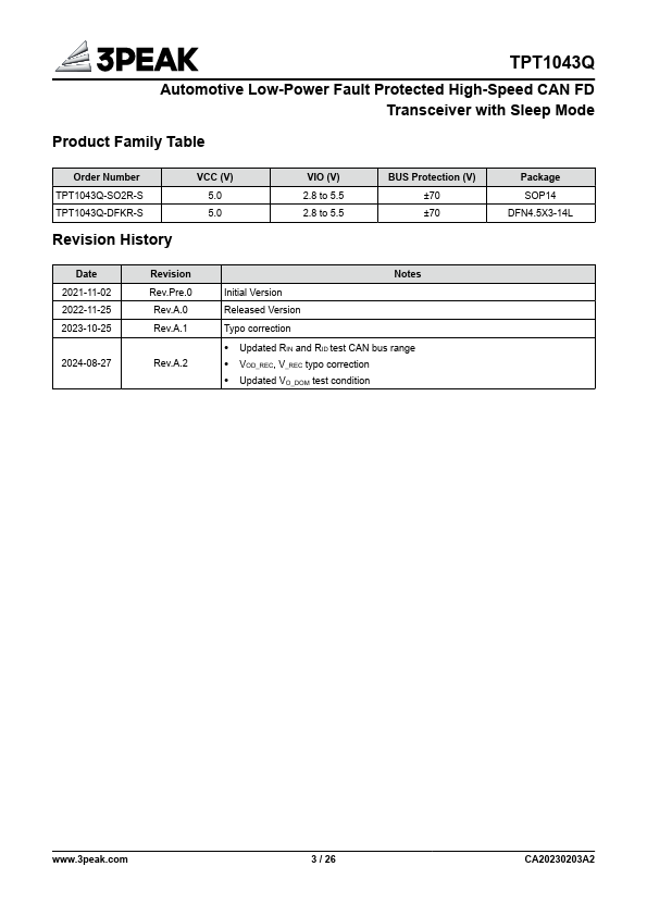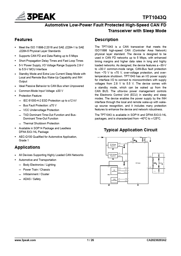 The TPT1043 is a CAN transceiver that meets the ISO11898 high-speed CAN (Controller Area Network) physical layer standard. The device is designed to be used in CAN FD networks up to 5 Mbps, with enhanced timing margins and higher data rates in long and highly loaded networks.