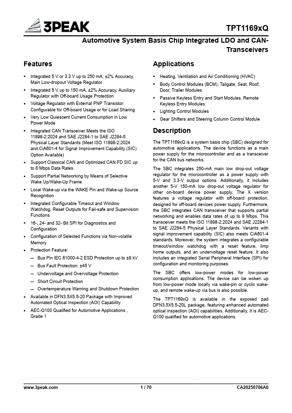 The TPT1169xQ is a system basis chip (SBC) designed for automotive applications. The device functions as a main power supply for the microcontroller and as a transceiver for the CAN bus networks. The SBC integrates 250-mA main low drop-out voltage regulator for the microcontroller as a power supply with 5-V and 3.3-V output options.