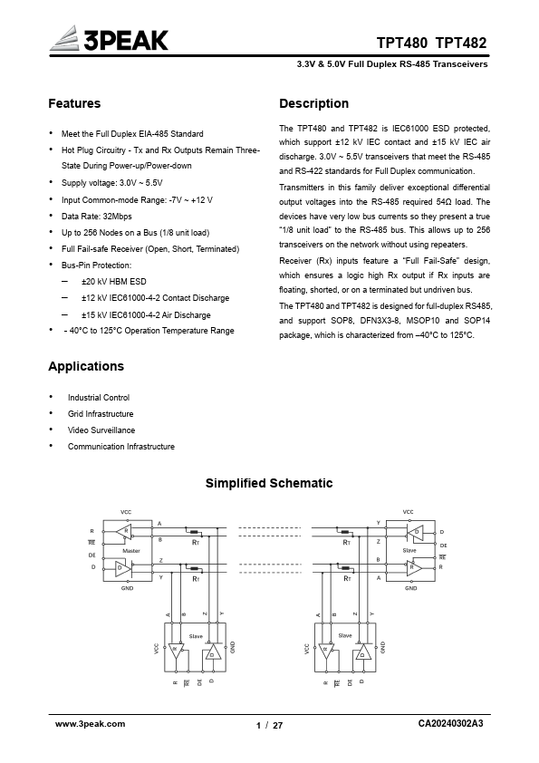 The TPT480 and TPT482 is IEC61000 ESD protected, which support ±12 kV IEC contact and ±15 kV IEC air discharge. 3.0V ~ 5.5V transceivers that meet the RS-485 and RS-422 standards for Full Duplex munication. Transmitters in this family deliver exceptional differential output voltages into the RS-485 required 54Ω load.