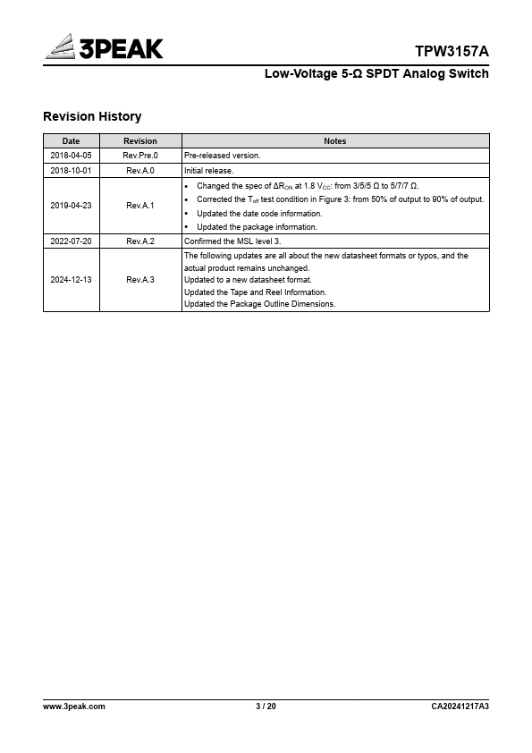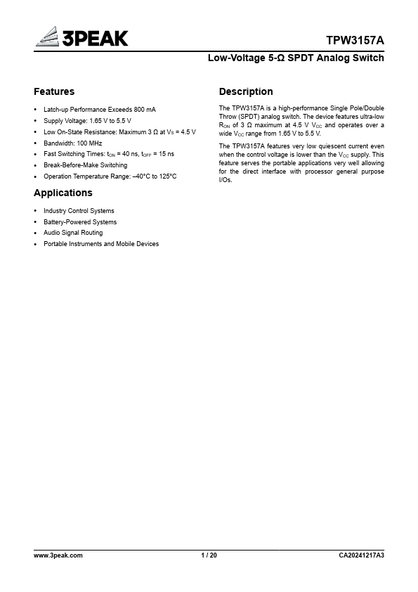 The TPW3157A is a high-performance Single Pole/Double Throw (SPDT) analog switch.