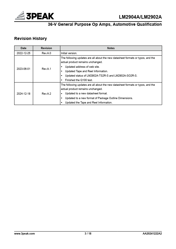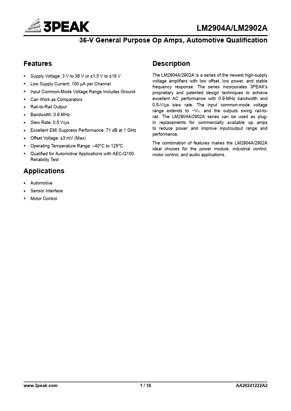 The LM2904A/2902A is a series of the newest high-supply voltage amplifiers with low offset, low power, and stable frequency response. The series incorporates 3PEAK’s proprietary and patented design techniques to achieve excellent AC performance with 0.9-MHz bandwidth and 0.5-V/μs slew rate. The input mon-mode voltage range extends to −VS, and the outputs swing rail-torail.
