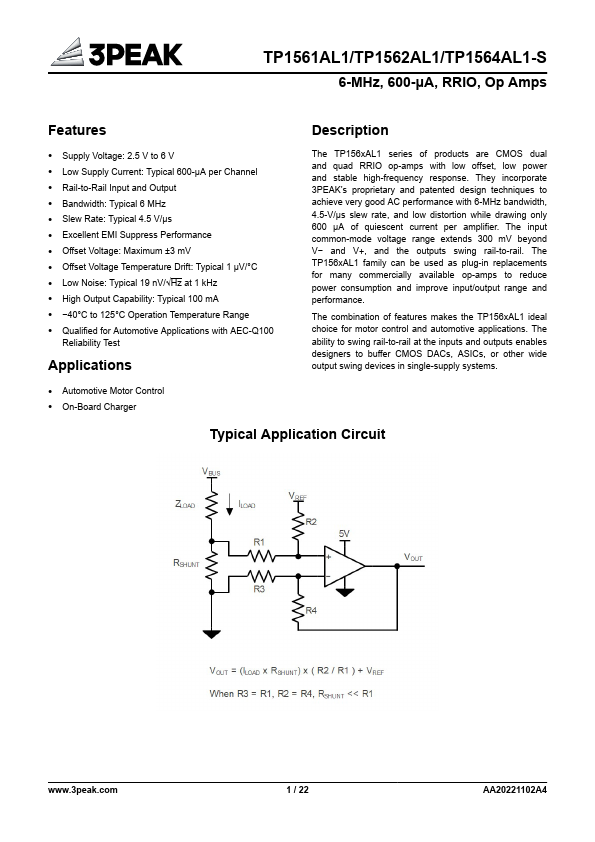 - Low Noise: Typical 19 nV/√Hz at 1 kHz
