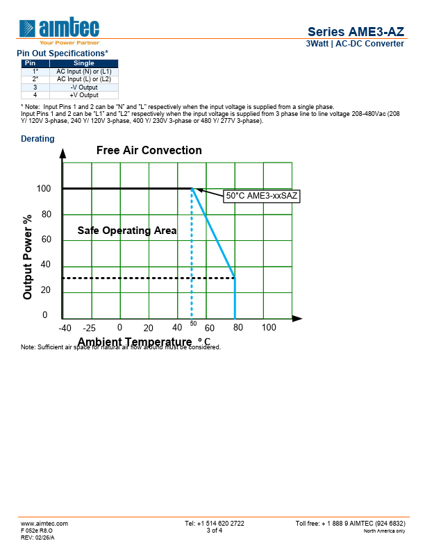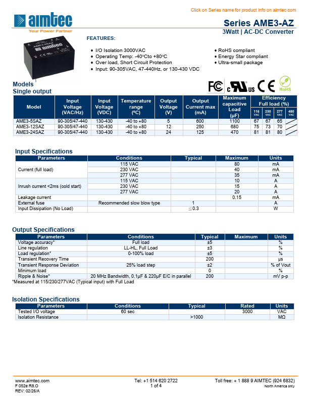 Click on Series name for product info on aimtec. Features : Series AME3-AZ 3Watt | AC-DC Converter - I/O Isolation 3000VAC - Operating Temp: -40oCto +80oC - Over load, Short Circuit Protection - Input: 90-305VAC, 47-440Hz, or 130-430 VDC - RoHS pliant - Energy Star pliant - Ultra-small package Models Single output Model Input Voltage (VAC/Hz) AME3-5SAZ AME3-12SAZ AME3-24SAZ 90-305/47-440 90-305/47-440 90-305/47-440 Input Voltage (VDC) 130-430 130-430 130-430 Temperature range (ºC) -40 to +80 -40 to +80 -40 to +80 Output Voltage (V) 5 12 24 Output Current max (mA) 600 250 125 Maximum capacitive Load (µF) 1100 680 470 Efficiency Full load...
