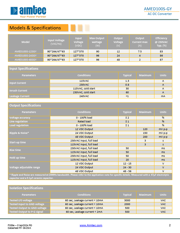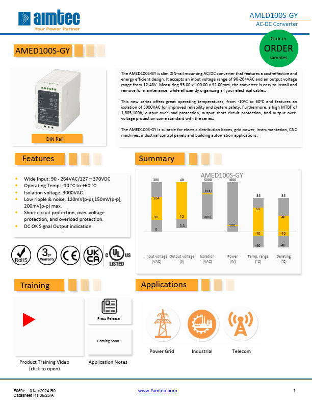 The AMED100S-GY is slim DIN-rail mounting AC/DC converter that Features a cost-effective and energy efficient design. It accepts an input voltage range of 90-264VAC and an output voltage range from 12-48V. Measuring 55.00 x 100.00 x 92.00mm, the converter is easy to install and remove for maintenance, while efficiently organizing all your electrical cables.