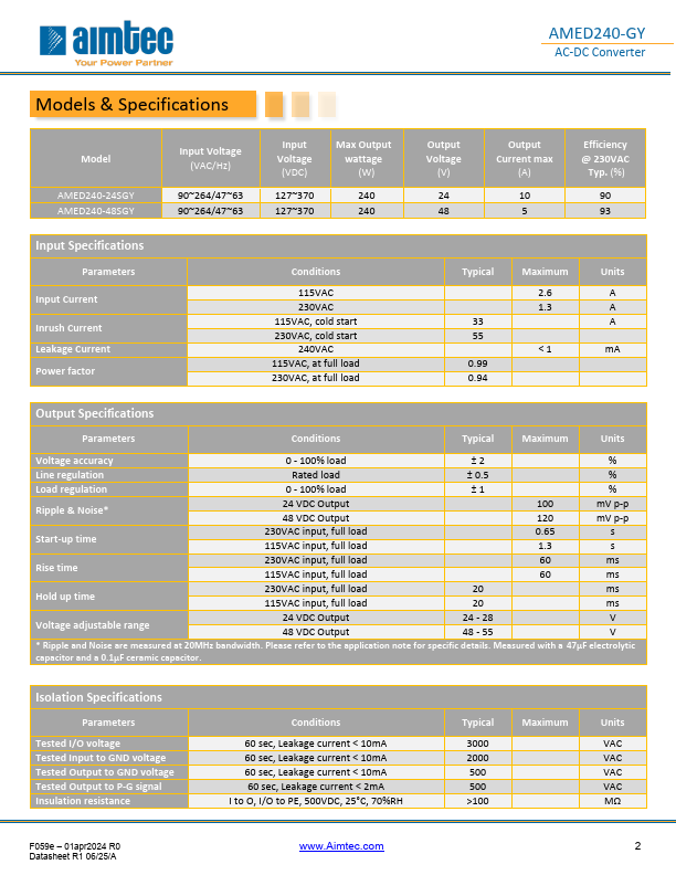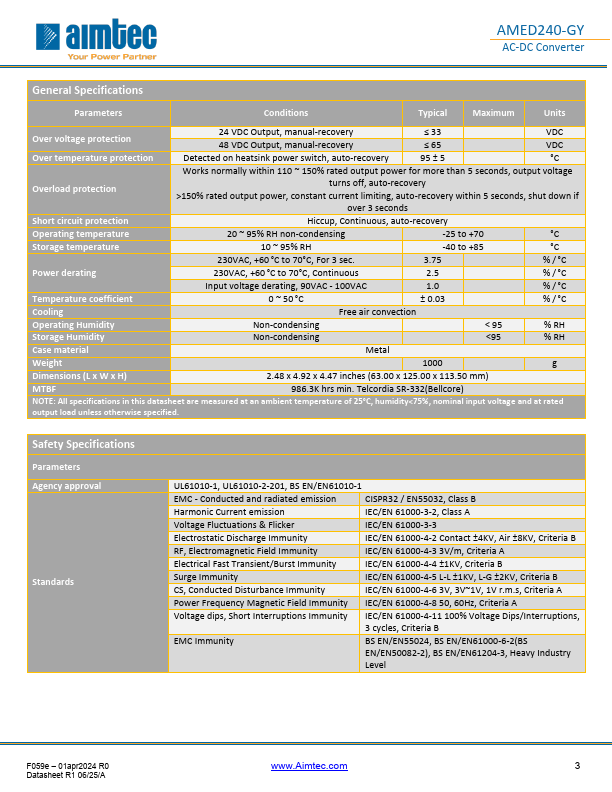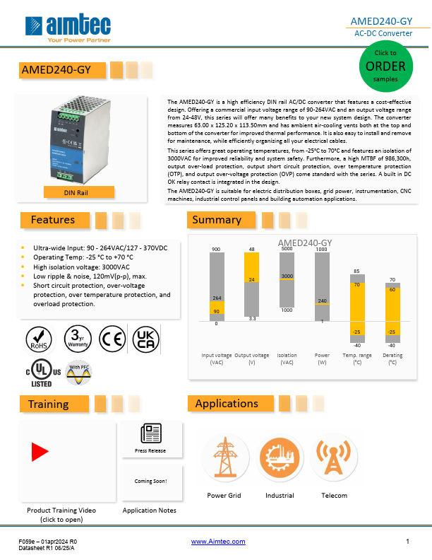 The AMED240-GY is a high efficiency DIN rail AC/DC converter that Features a cost-effective design. Offering a mercial input voltage range of 90-264VAC and an output voltage range from 24-48V, this series will offer many benefits to your new system design. The converter measures 63.00 x 125.20 x 113.50mm and has ambient air-cooling vents both at the top and bottom of the converter for improved thermal performance. It is also easy to install and remove for maintenance, while efficiently organizing all your electrical cables.