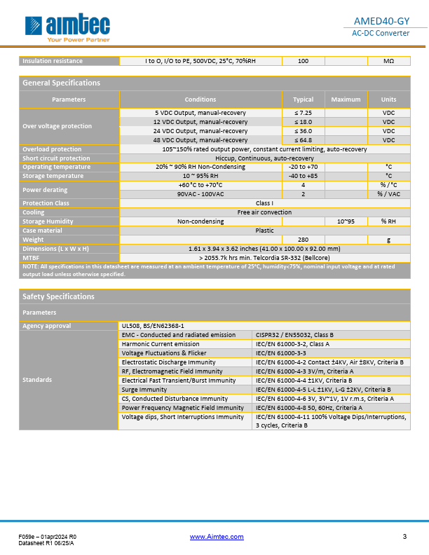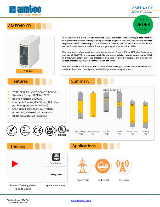 The AMED40-GY is a slim DIN-rail mounting AC/DC converter series featuring a cost effective, energy efficient solution. It accepts an input voltage range of 90-264VAC, and an output voltage range from 5-48V. Measuring 41.00 x 100.00 x 92.00mm, the DIN rail is easy to install and remove for maintenance, while efficiently organizing all your electrical cables.