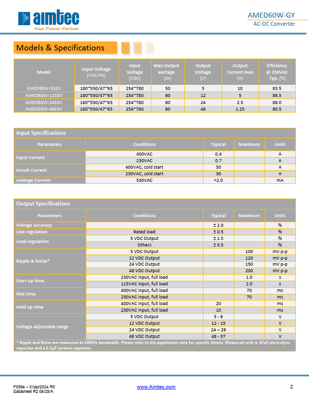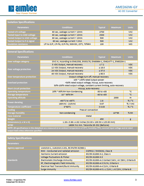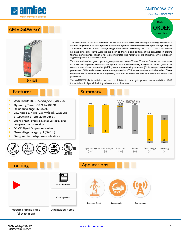 The AMED60W-GY is a cost-effective DIN rail AC/DC converter that offers great energy efficiency. It accepts single and dual phase power distribution systems with an ultra-wide input voltage range of 180-550VAC and an output voltage range from 5-48V. Measuring 32.00 x 100.50 x 125.00mm, ambient air-cooling vents were placed both at the top and bottom of the converter improving thermal performance. The DIN rail is easy to install and remove for maintenance, while efficiently organizing all your electrical cables. This new series offers great operating temperatures, from -30°C to 85°C also Features an isolation...