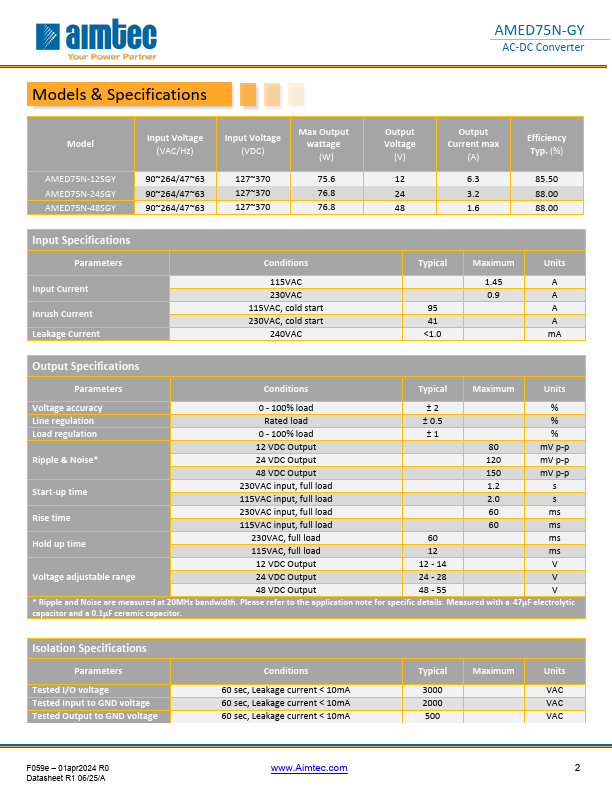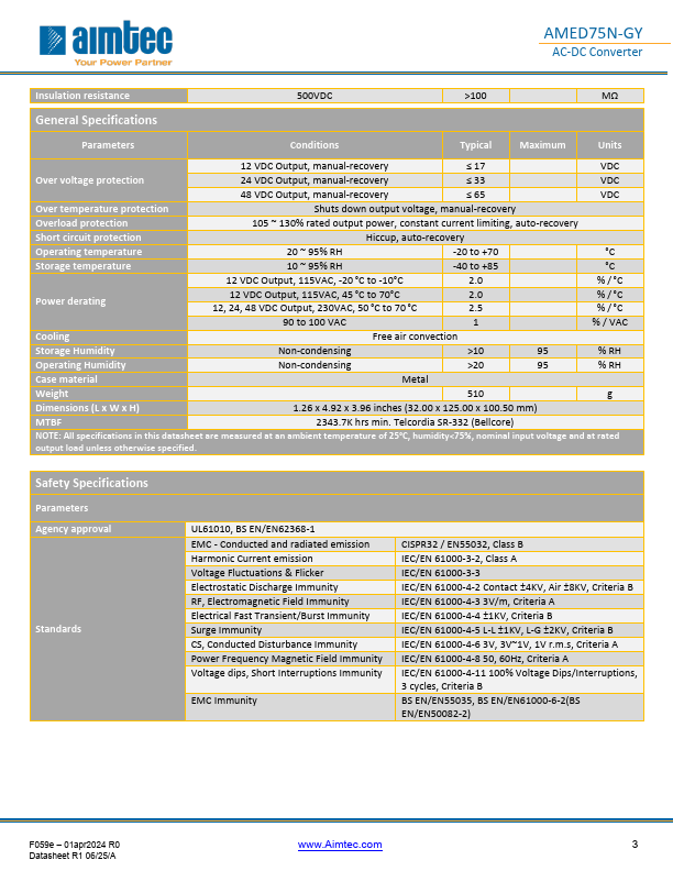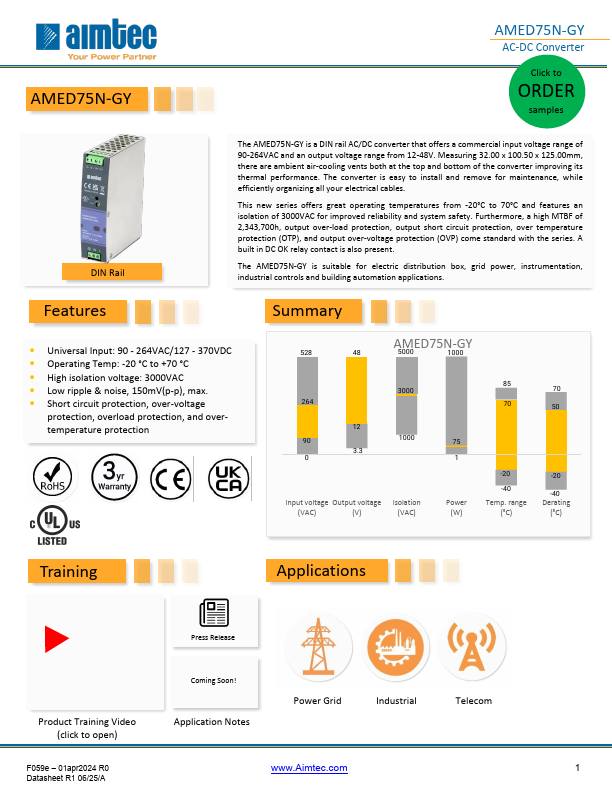 The AMED75N-GY is a DIN rail AC/DC converter that offers a mercial input voltage range of 90-264VAC and an output voltage range from 12-48V. Measuring 32.00 x 100.50 x 125.00mm, there are ambient air-cooling vents both at the top and bottom of the converter improving its thermal performance. The converter is easy to install and remove for maintenance, while efficiently organizing all your electrical cables.