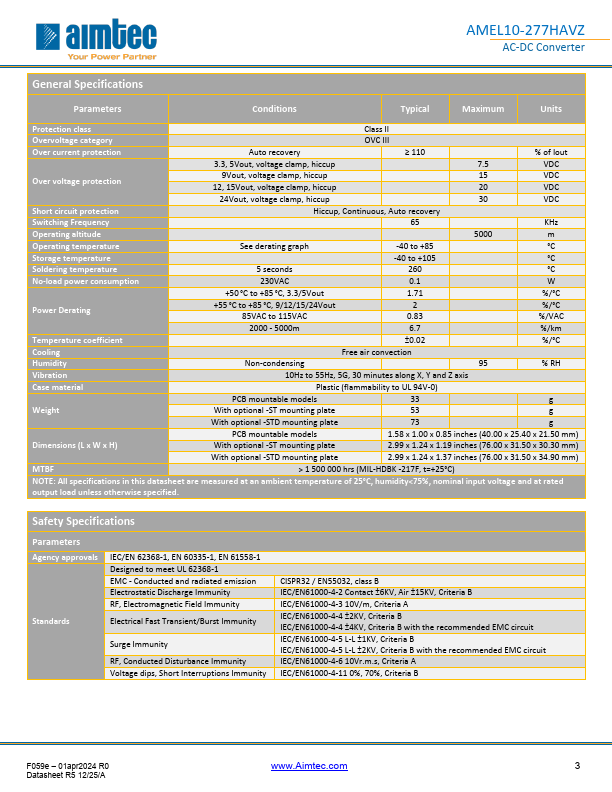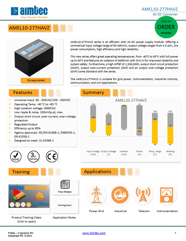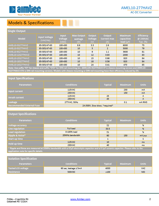 AMEL10-277HAVZ series is an efficient 10W AC-DC power supply module. Offering a mercial input voltage range of 85-305VAC, output voltage ranges from 3.3-24V, low power consumption, high efficiency and high reliability.