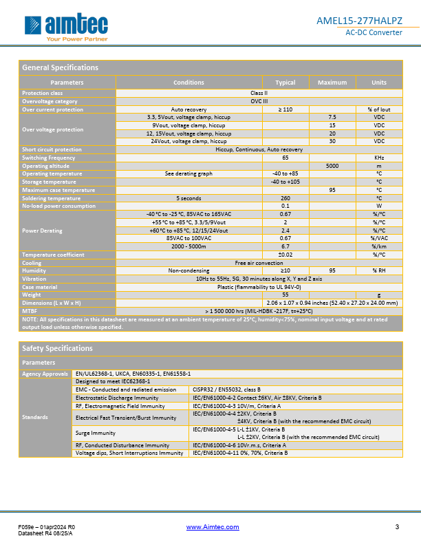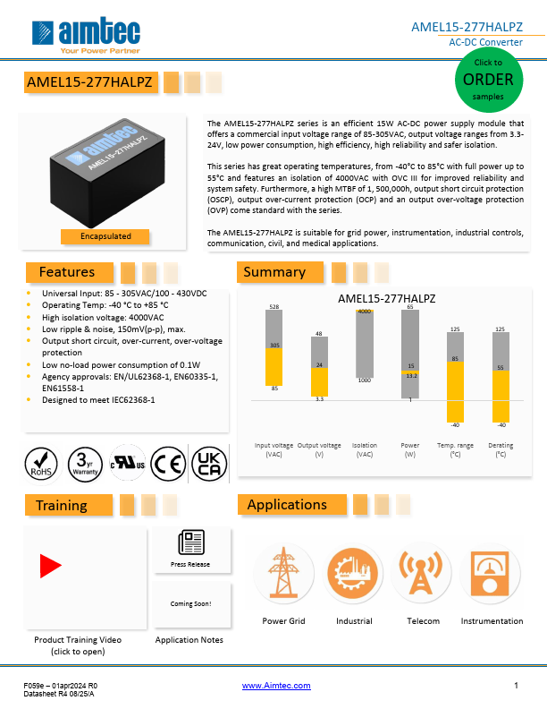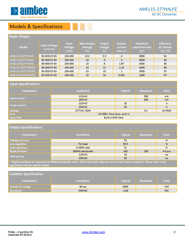 The AMEL15-277HALPZ series is an efficient 15W AC-DC power supply module that offers a mercial input voltage range of 85-305VAC, output voltage ranges from 3.324V, low power consumption, high efficiency, high reliability and safer isolation.