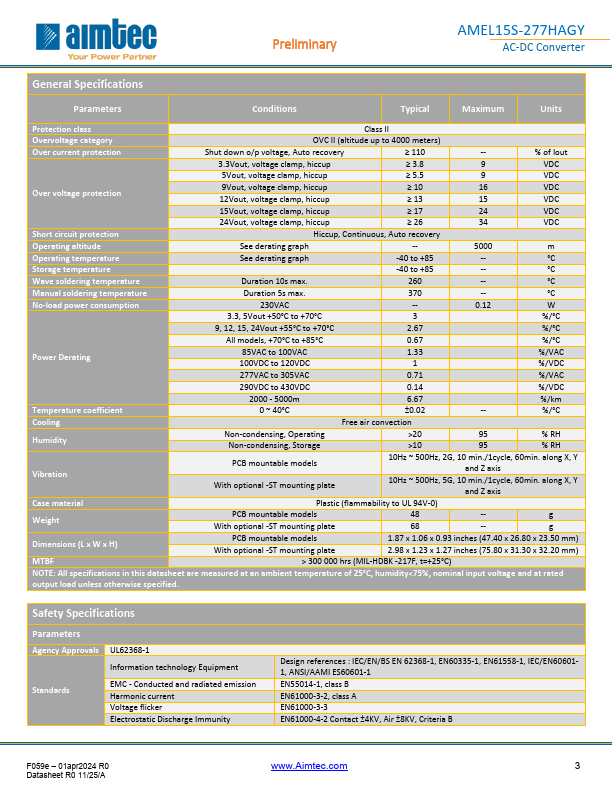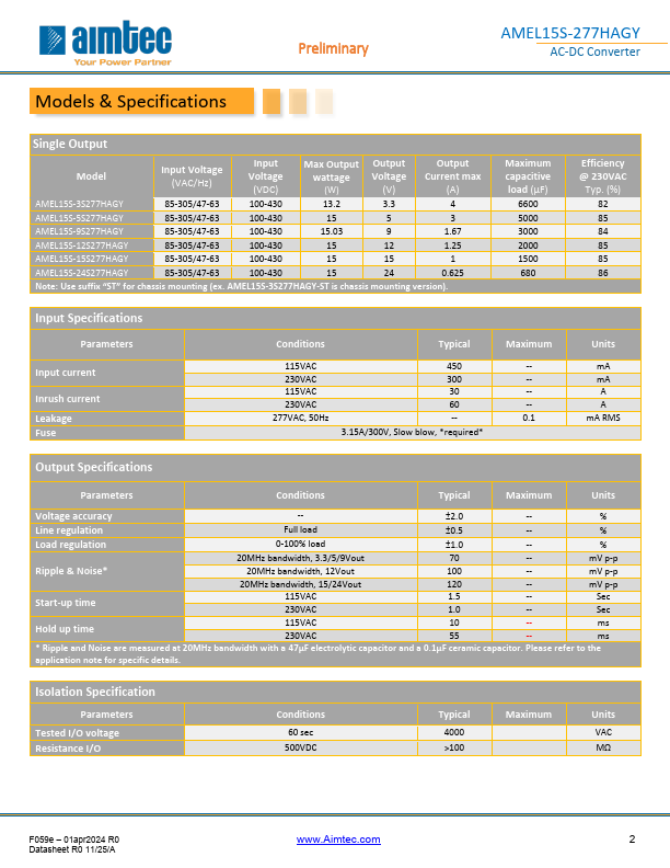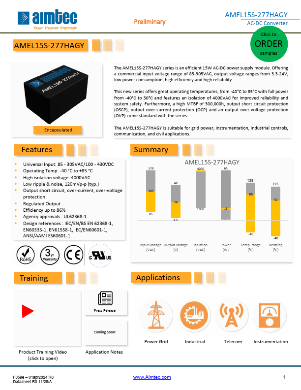 The AMEL15S-277HAGY series is an efficient 15W AC-DC power supply module. Offering a mercial input voltage range of 85-305VAC, output voltage ranges from 3.3-24V, low power consumption, high efficiency and high reliability.