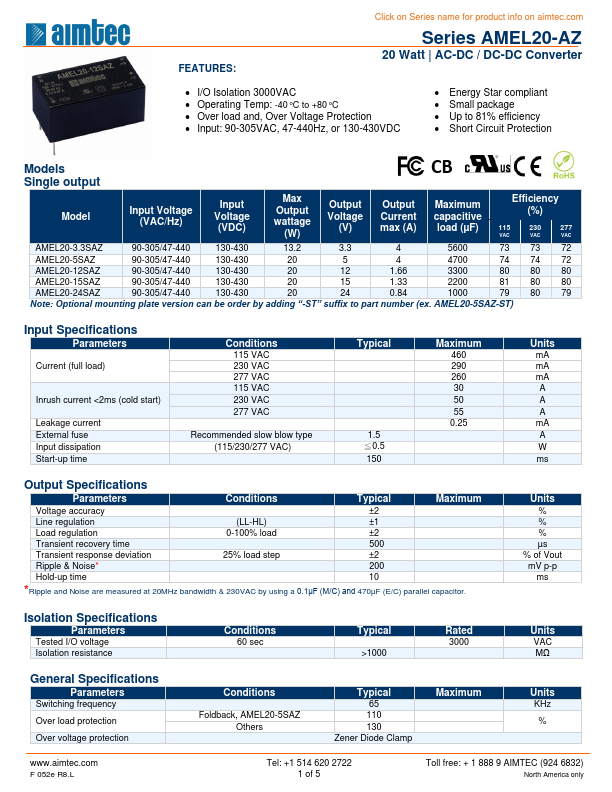 - Click on Series name for product info on aimtec. Series AMEL20-AZ 20 Watt | AC-DC / DC-DC Converter