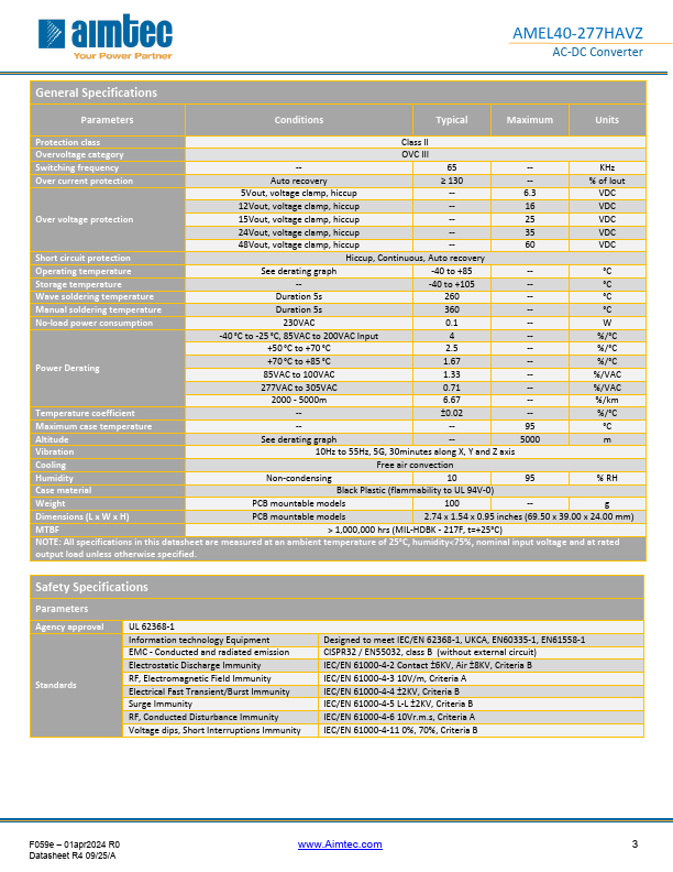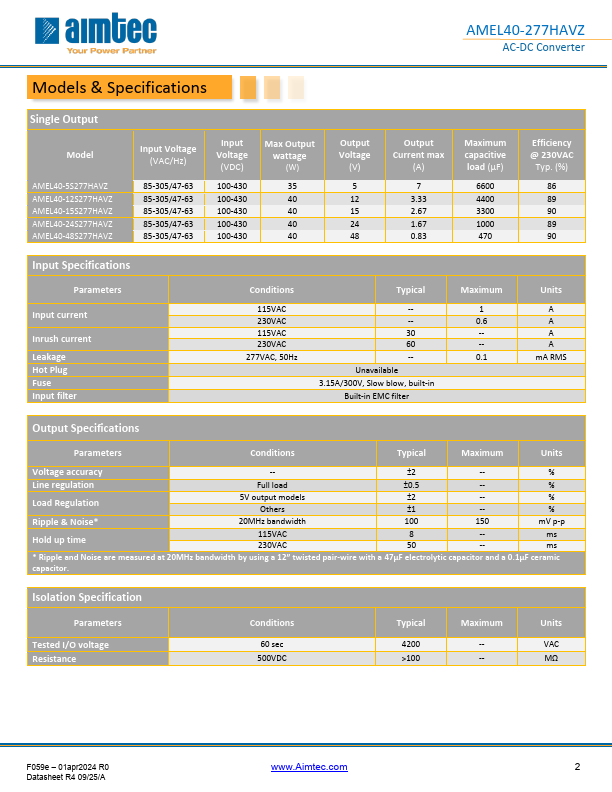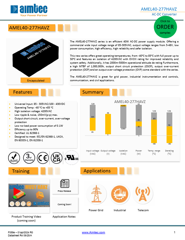 The AMEL40-277HAVZ series is an efficient 40W AC-DC power supply module. Offering a mercial wide input voltage range of 85-305VAC, output voltage ranges from 5-48V, low power consumption, high efficiency, high reliability and safer isolation.