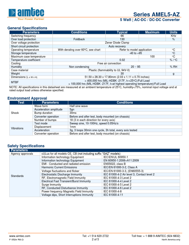 Click on Series name for product info on aimtec. Series AMEL5-AZ 5 Watt | AC-DC / DC-DC Converter Features : - I/O Isolation 3000VAC - Operating Temp: -40 oC to +95 oC - Input: 90-305VAC, 47-440Hz, or 130-430VDC - Over load, Over Voltage, Short Circuit Protection - RoHS pliant - Energy Star pliant - Efficiency up to 76% - Soft start Models Single output Model Input Voltage (VAC/Hz) Input Voltage (VDC) Temperature range (ºC) Output Voltage (V) Output Current max (A) Maximum capacitive Load (µF) Efficiency (%) 115 VAC 230 VAC 277 VAC AMEL5-3.3SAZ 90-305/47-440...
