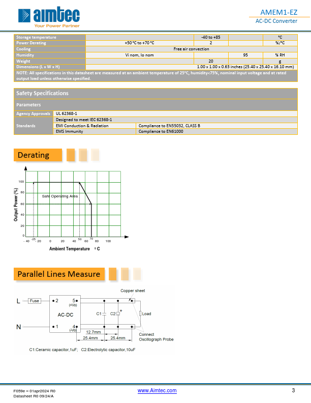AMEM1-EZ AMEM1-EZ AC-DC Converter Click to ORDER samples Encapsulated AMEM1-EZ series is an efficient 1W AC-DC power supply module. Offering a mercial input voltage range of 90-264VAC, output voltage ranges from 3.3-48V, and safer isolation. This new series offers great operating temperatures, from -25°C to 70°C with full power up to 50°C and Features an isolation of 3000VAC for improved reliability and system safety. Furthermore, an output short circuit protection (OSCP), output over-current protection (OCP) and an output over-voltage protection (OVP) e standard with the series. The AMEM1-EZ is suitable for grid power, LED, instrumentation, industrial controls, munication, and...