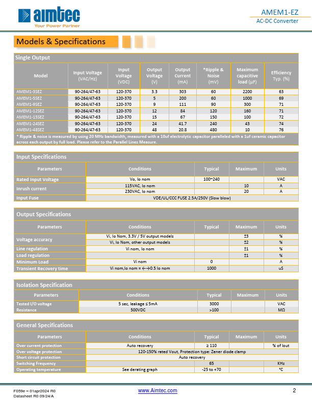 AMEM1-EZ AMEM1-EZ AC-DC Converter Click to ORDER samples Encapsulated AMEM1-EZ series is an efficient 1W AC-DC power supply module. Offering a mercial input voltage range of 90-264VAC, output voltage ranges from 3.3-48V, and safer isolation. This new series offers great operating temperatures, from -25°C to 70°C with full power up to 50°C and Features an isolation of 3000VAC for improved reliability and system safety. Furthermore, an output short circuit protection (OSCP), output over-current protection (OCP) and an output over-voltage protection (OVP) e standard with the series. The AMEM1-EZ is suitable for grid power, LED, instrumentation, industrial controls, munication, and...