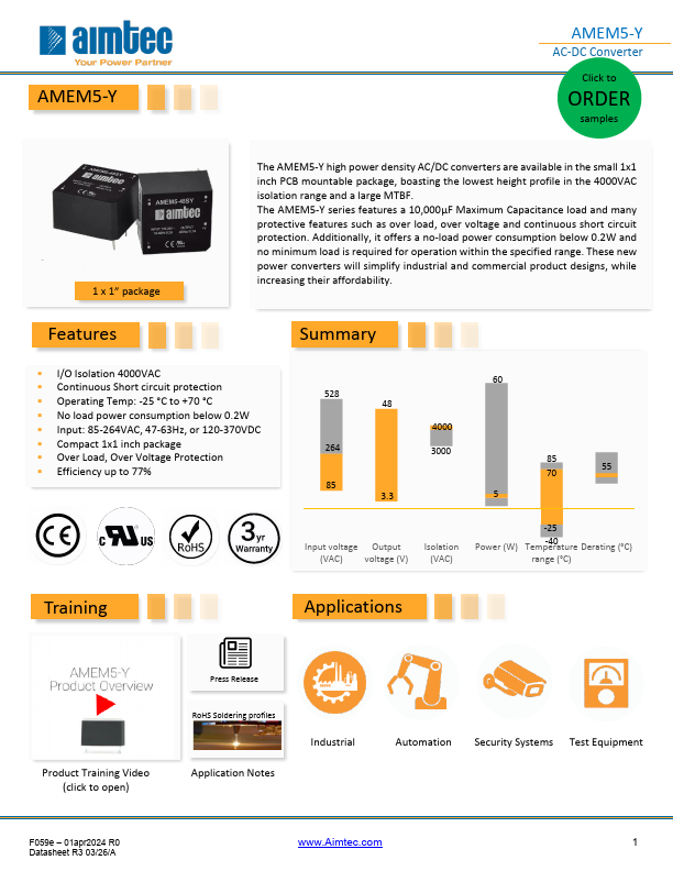 AMEM5-Y AMEM5-Y AC-DC Converter Click to ORDER samples 1 x 1” package The AMEM5-Y high power density AC/DC converters are available in the small 1x1 inch PCB mountable package, boasting the lowest height profile in the 4000VAC isolation range and a large MTBF. The AMEM5-Y series Features a 10,000μF Maximum Capacitance load and many protective Features such as over load, over voltage and continuous short circuit protection. Additionally, it offers a no-load power consumption below 0.2W and no minimum load is required for operation within the specified range. These new power converters will simplify industrial and mercial product designs, while increasing their affordability. Features...