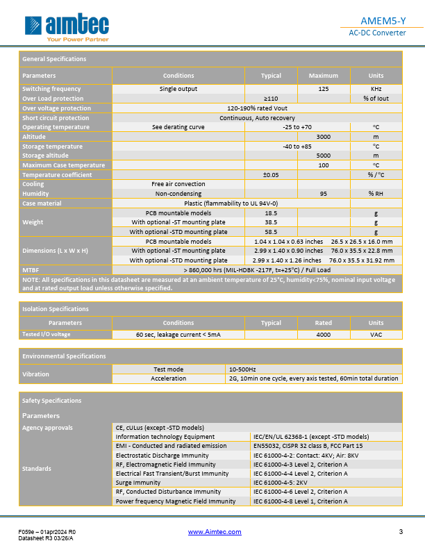 AMEM5-Y AMEM5-Y AC-DC Converter Click to ORDER samples 1 x 1” package The AMEM5-Y high power density AC/DC converters are available in the small 1x1 inch PCB mountable package, boasting the lowest height profile in the 4000VAC isolation range and a large MTBF. The AMEM5-Y series Features a 10,000μF Maximum Capacitance load and many protective Features such as over load, over voltage and continuous short circuit protection. Additionally, it offers a no-load power consumption below 0.2W and no minimum load is required for operation within the specified range. These new power converters will simplify industrial and mercial product designs, while increasing their affordability. Features...