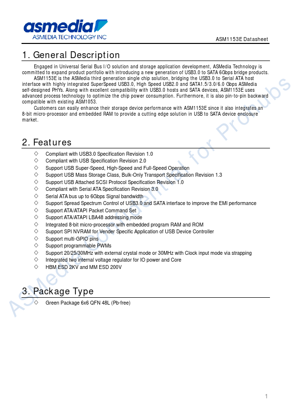 Engaged in Universal Serial Bus I/O solution and storage application development, ASMedia Technology is mitted to expand product portfolio with introducing a new generation of USB3.0 to SATA 6Gbps bridge products. ASM1153E is the ASMedia third generation single chip solution, bridging the USB3.0 to Serial ATA host interface with highly integrated SuperSpeed USB3.0, High Speed USB2.0 and SATA1.5/3.0/6.0 Gbps ASMedia...
