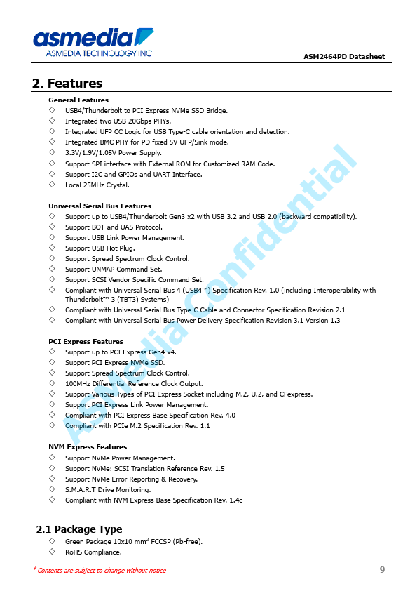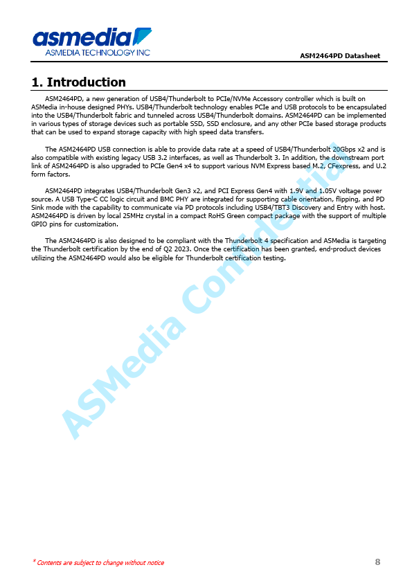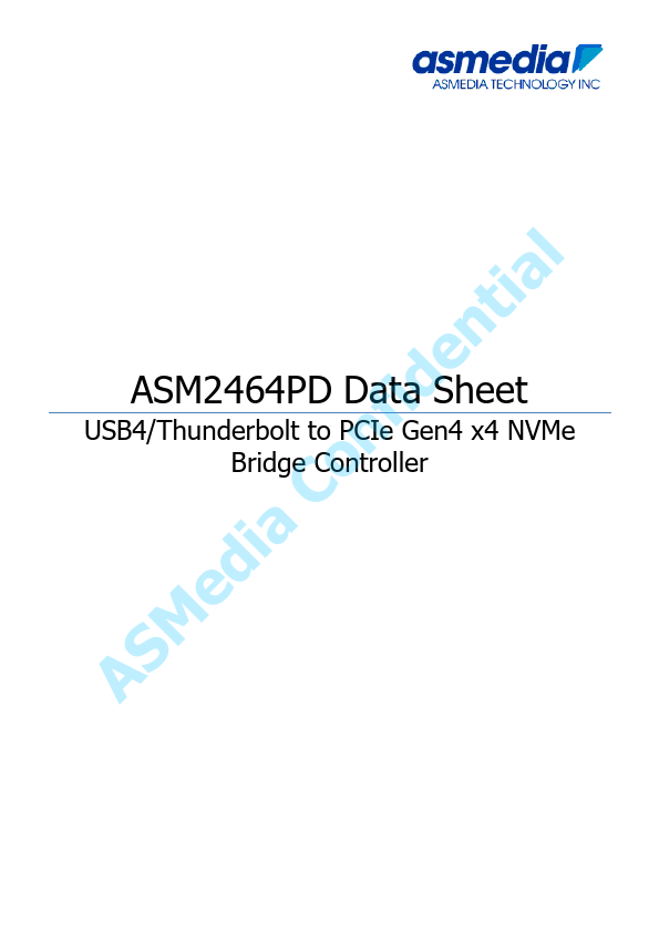 ASMedia Confidential ASM2464PD Data Sheet USB4/Thunderbolt to PCIe Gen4 x4 NVMe Bridge Controller ASM2464PD Datasheet 1. Introduction ASM2464PD, a new generation of USB4/Thunderbolt to PCIe/NVMe Accessory controller which is built on ASMedia in-house designed PHYs. USB4/Thunderbolt technology enables PCIe and USB protocols to be encapsulated into the USB4/Thunderbolt fabric and tunneled across USB4/Thunderbolt...