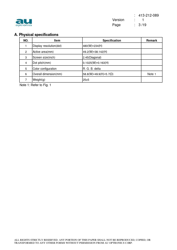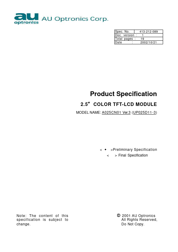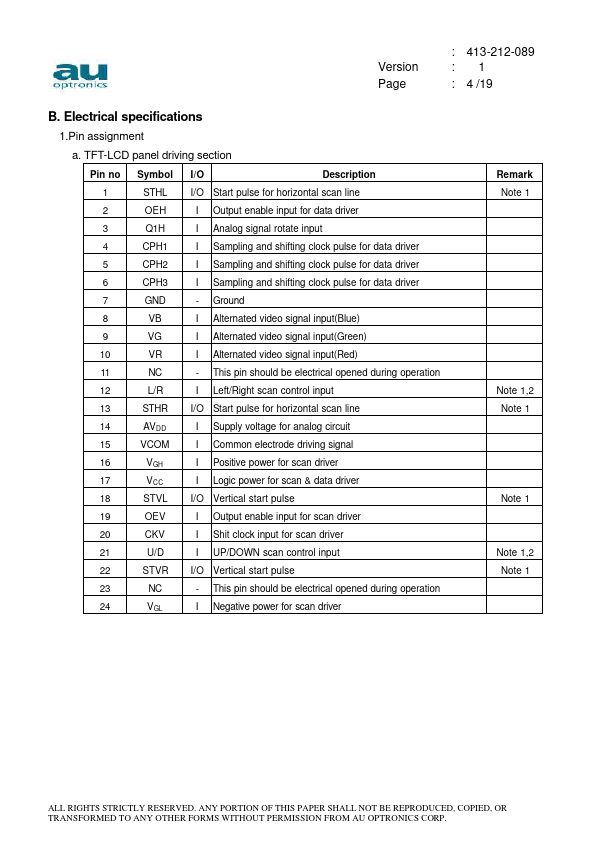 ANY PORTION OF THIS PAPER SHALL NOT BE REPRODUCED, COPIED, OR TRANSFORMED TO ANY OTHER FORMS WITHOUT PERMISSION FROM AU OPTRONICS CORP. Selection of scanning mode Setting of scan control input U/D L/R GND VCC STVR OUT IN/OUT state For start pulse STVL STHR IN OUT VCC GND IN OUT IN GND GND OUT IN IN VCC VCC IN OUT OUT IN: Definition of scanning direction.