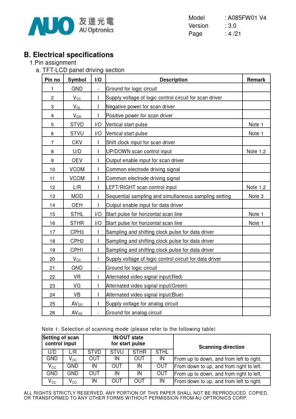 Selection of scanning mode (please refer to the following table) Setting of scan control input U/D GND VCC GND L/R VCC GND GND STVD OUT IN OUT IN/OUT state for start pulse STVU IN OUT IN STHR OUT IN IN STHL IN OUT OUT Scanning direction From up to down, and from left to right. From down to up, and from right to left. From up to down, and from right to left.