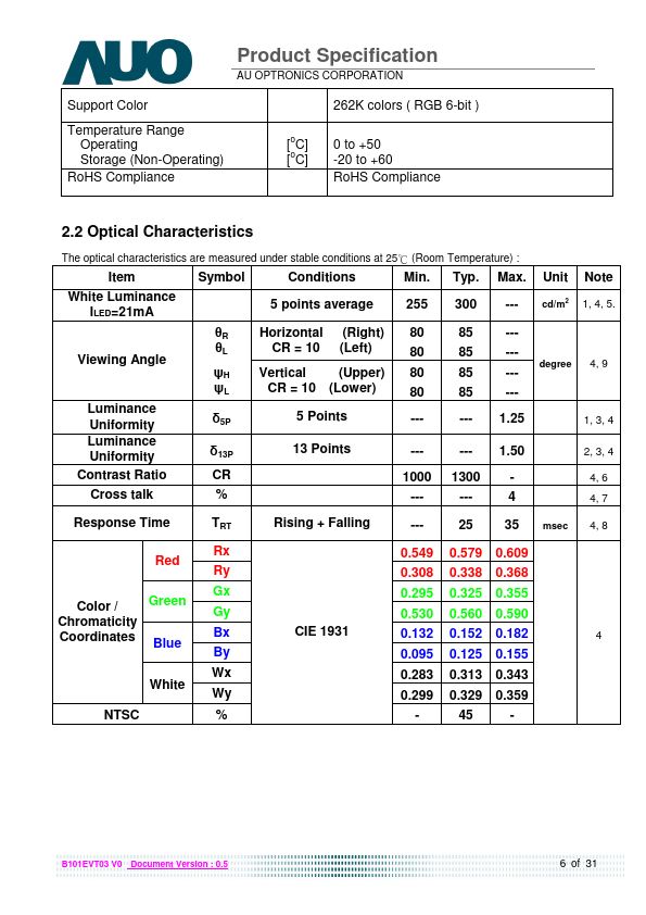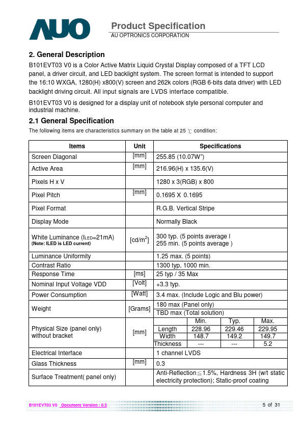 B101EVT03 V0 is a Color Active Matrix Liquid Crystal Display posed of a TFT LCD panel, a driver circuit, and LED backlight system. The screen format is intended to support the 16:10 WXGA, 1280(H) x800(V) screen and 262k colors (RGB 6-bits data driver) with LED backlight driving circuit. All input signals are LVDS interface patible.