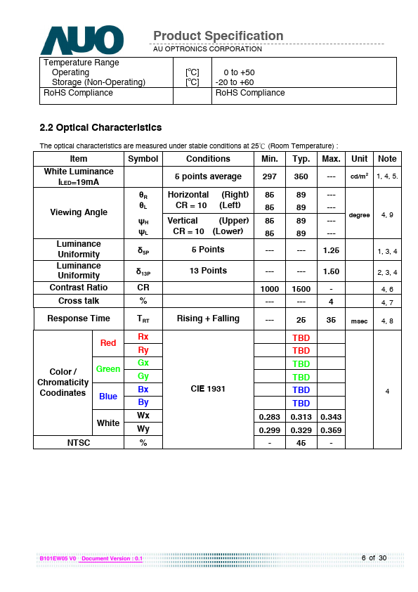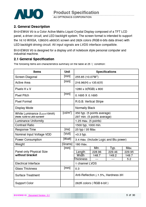 Product Specification AU OPTRONICS CORPORATION ( V ) Preliminary Specifications ( ) Final Specifications Module Model Name Note 10.1”(10.07”) WXGA 16:10 Color TFT-LCD with LED Backlight design B101EW05 V0 (H/W:0A ) LED Backlight with driving circuit design Color Management (Virtual and Rich Color Solution ) Dynamic Contrast Ratio (Power Saving Solution) Customer Date Approved by Date Checked & Approved by Date Note: This Specification is subject to change without notice. CH Lin 09/14/2010 Prepared by YW LEE 09/14/2010 NBBU Marketing Division AU Optronics corporation B101EW05 V0 Document Version : 0.1 1 of 30 Product Specification AU OPTRONICS CORPORATION 2. General...
