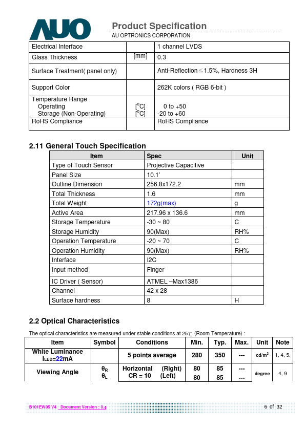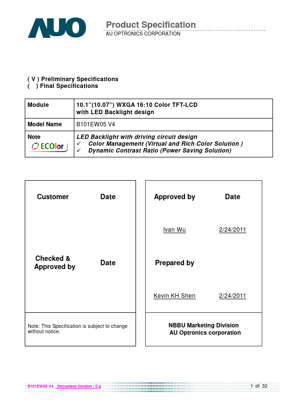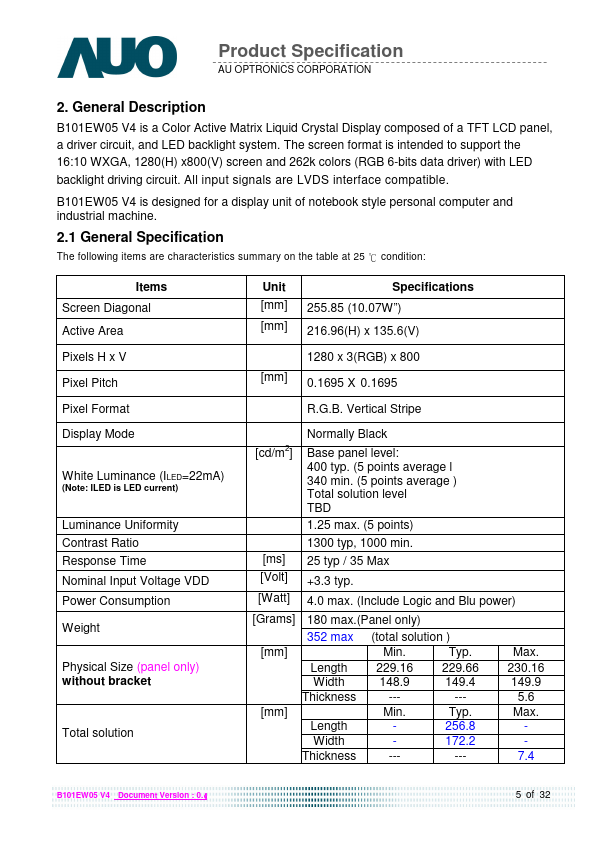 B101EW05 V4 Document Version : 0.