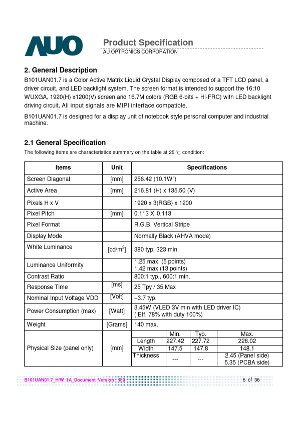 B101UAN01.7 is a Color Active Matrix Liquid Crystal Display posed of a TFT LCD panel, a driver circuit, and LED backlight system. The screen format is intended to support the 16:10 WUXGA, 1920(H) x1200(V) screen and 16.7M colors (RGB 6-bits + Hi-FRC) with LED backlight driving circuit. All input signals are MIPI interface patible.