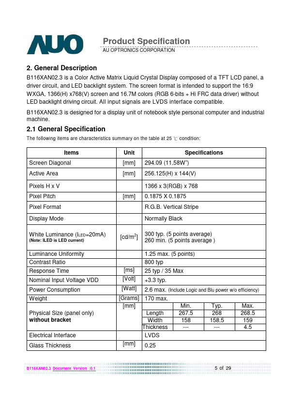 B116XAN02.3 is a Color Active Matrix Liquid Crystal Display posed of a TFT LCD panel, a driver circuit, and LED backlight system. The screen format is intended to support the 16:9 WXGA, 1366(H) x768(V) screen and 16.7M colors (RGB 6-bits + Hi FRC data driver) without LED backlight driving circuit. All input signals are LVDS interface patible.