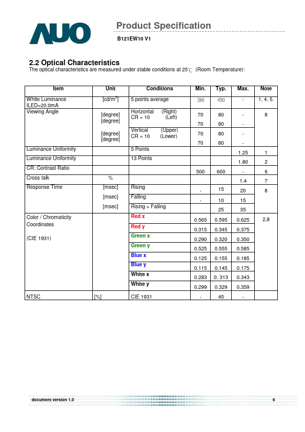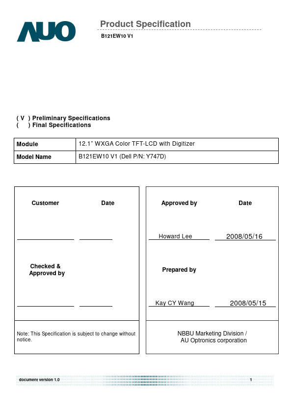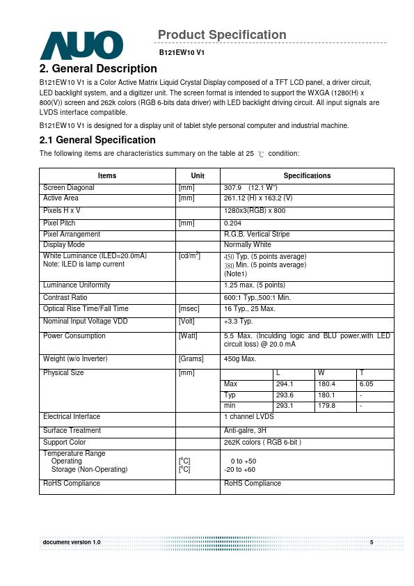 B121EW10 V1 is a Color Active Matrix Liquid Crystal Display posed of a TFT LCD panel, a driver circuit, LED backlight system, and a digitizer unit. The screen format is intended to support the WXGA (1280(H) x 800(V)) screen and 262k colors (RGB 6-bits data driver) with LED backlight driving circuit. All input signals are LVDS interface patible.