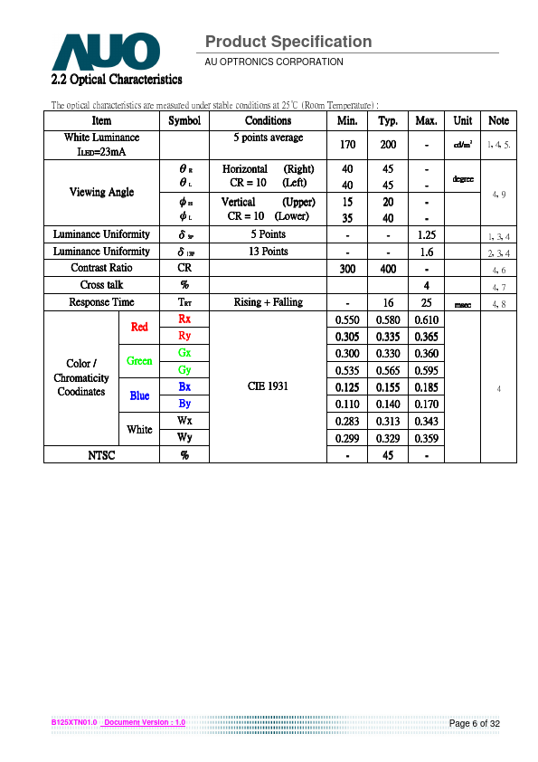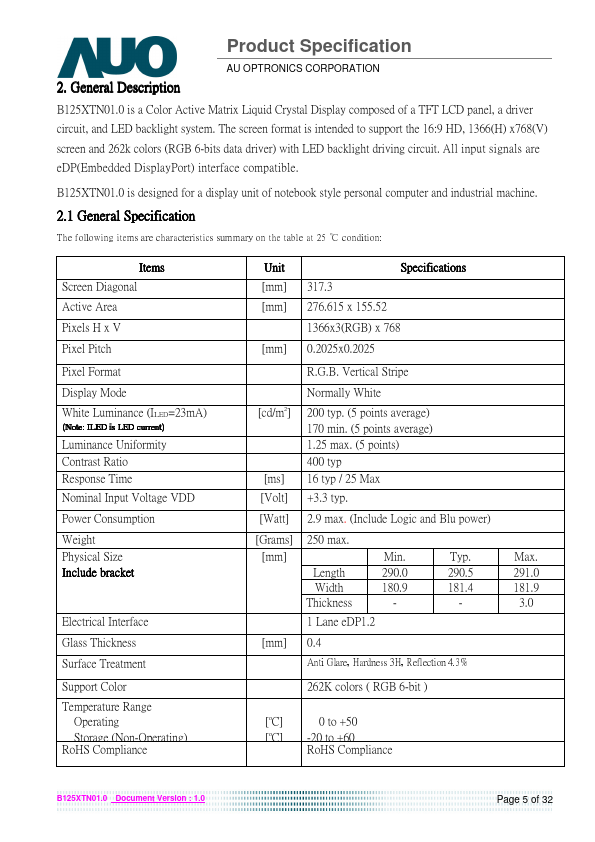 AU OPTRONICS CORPORATION B125XTN01.0 is a Color Active Matrix Liquid Crystal Display posed of a TFT LCD panel, a driver circuit, and LED backlight system. The screen format is intended to support the 16:9 HD, 1366(H) x768(V) screen and 262k colors (RGB 6-bits data driver) with LED backlight driving circuit. All input signals are eDP(Embedded DisplayPort) interface patible.