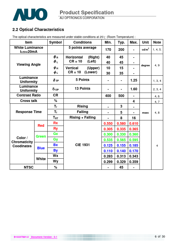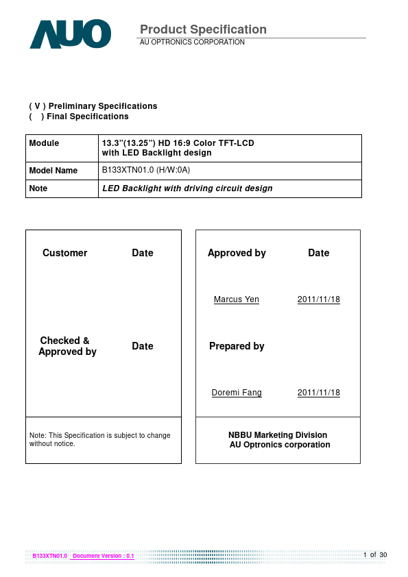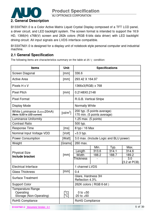 B133XTN01.0 is a Color Active Matrix Liquid Crystal Display posed of a TFT LCD panel, a driver circuit, and LED backlight system. The screen format is intended to support the 16:9 HD, 1366(H) x768(V) screen and 262k colors (RGB 6-bits data driver) with LED backlight driving circuit. All input signals are LVDS interface patible.