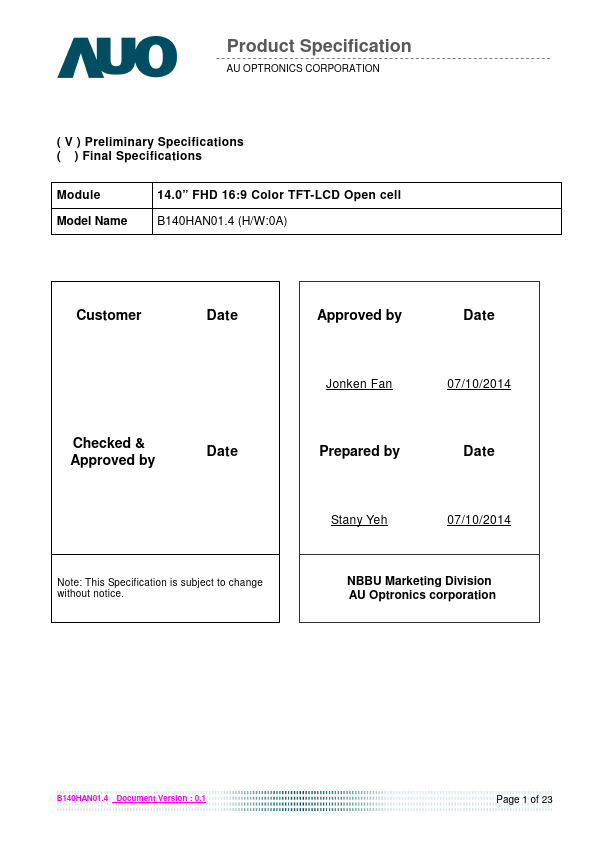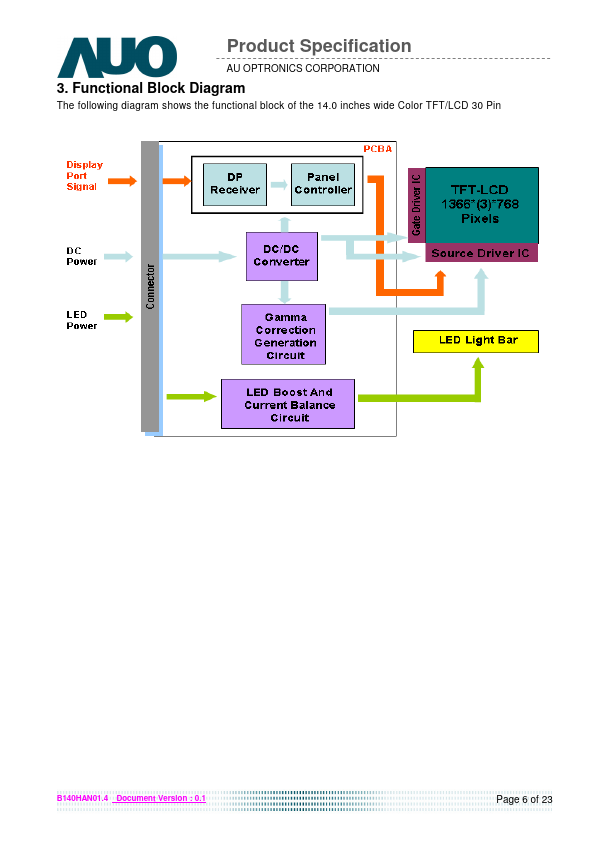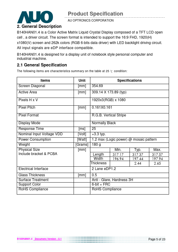 B140HAN01.4 is a Color Active Matrix Liquid Crystal Display posed of a TFT LCD open cell , a driver circuit. The screen format is intended to support the 16:9 FHD, 1920(H) x1080(V) screen and 262k colors (RGB 6-bits data driver) with LED backlight driving circuit. All input signals are eDP interface patible.