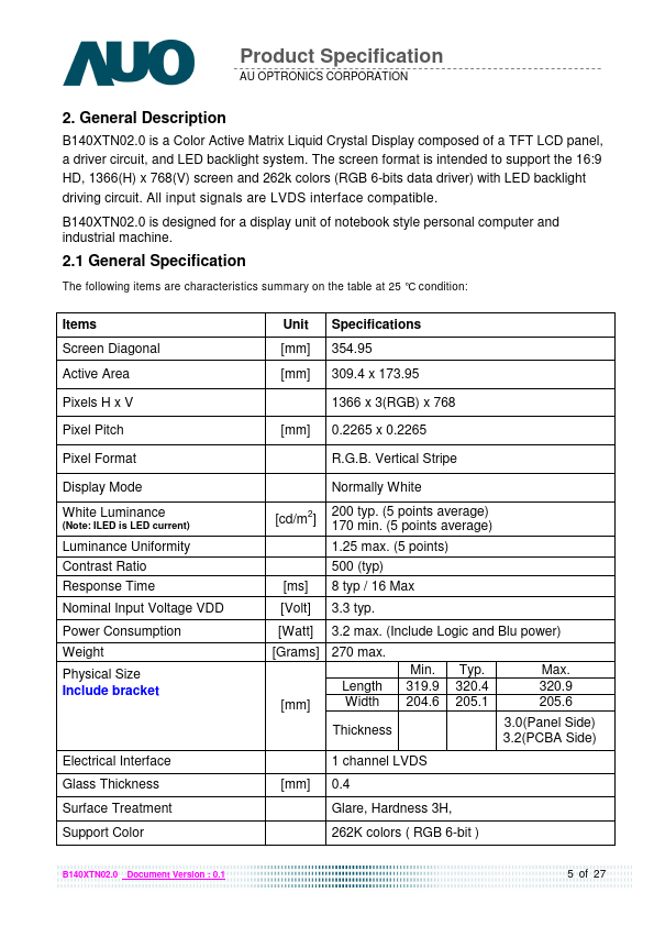 B140XTN02.0 is a Color Active Matrix Liquid Crystal Display posed of a TFT LCD panel, a driver circuit, and LED backlight system. The screen format is intended to support the 16:9 HD, 1366(H) x 768(V) screen and 262k colors (RGB 6-bits data driver) with LED backlight driving circuit. All input signals are LVDS interface patible.