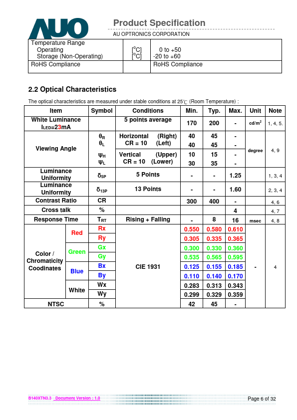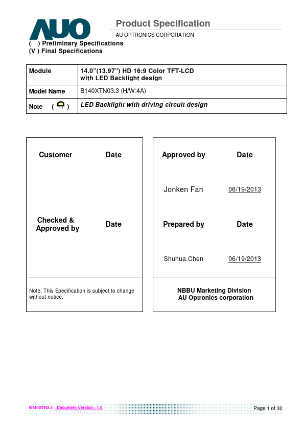 B140XTN03.3 is a Color Active Matrix Liquid Crystal Display posed of a TFT LCD panel, a driver circuit, and LED backlight system. The screen format is intended to support the 16:9 HD, 1366(H) x768(V) screen and 262k colors (RGB 6-bits data driver) with LED backlight driving circuit. All input signals are eDP(Embedded DisplayPort) interface patible.