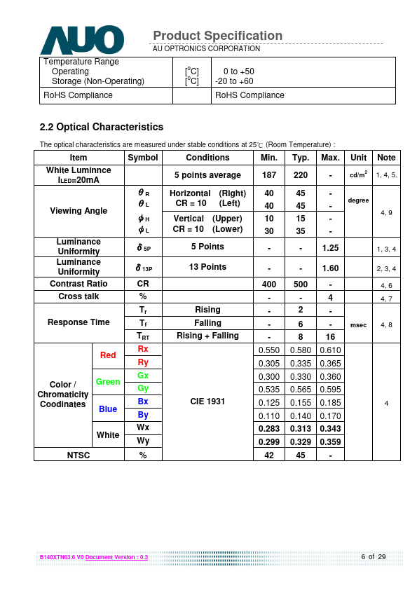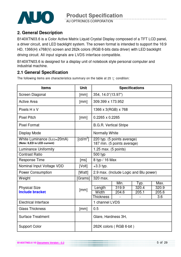 B140XTN03.6 is a Color Active Matrix Liquid Crystal Display posed of a TFT LCD panel, a driver circuit, and LED backlight system. The screen format is intended to support the 16:9 HD, 1366(H) x768(V) screen and 262k colors (RGB 6-bits data driver) with LED backlight driving circuit. All input signals are LVDS interface patible.