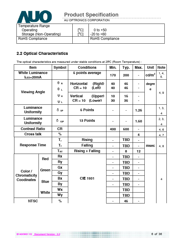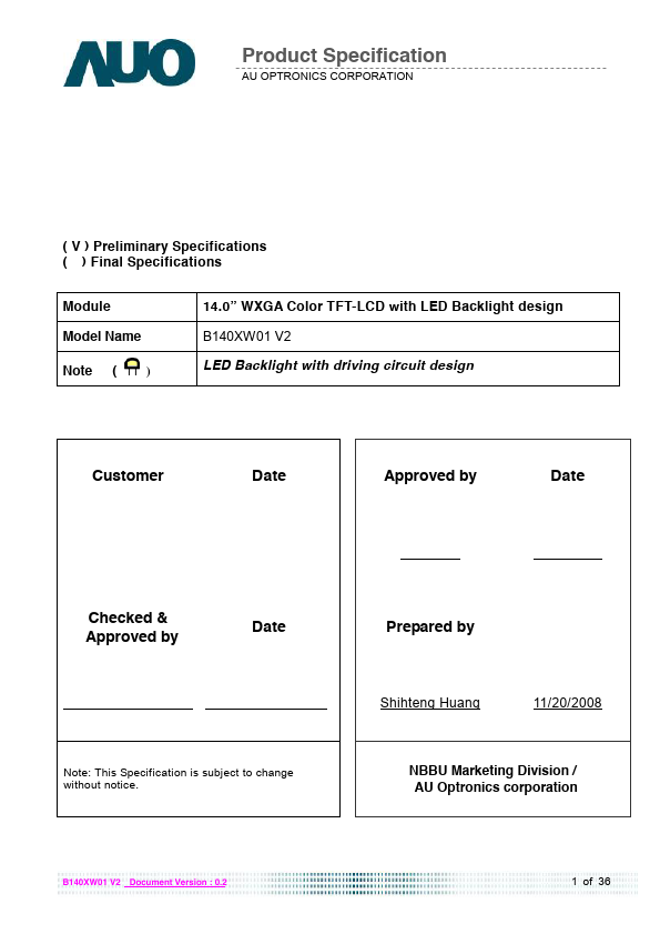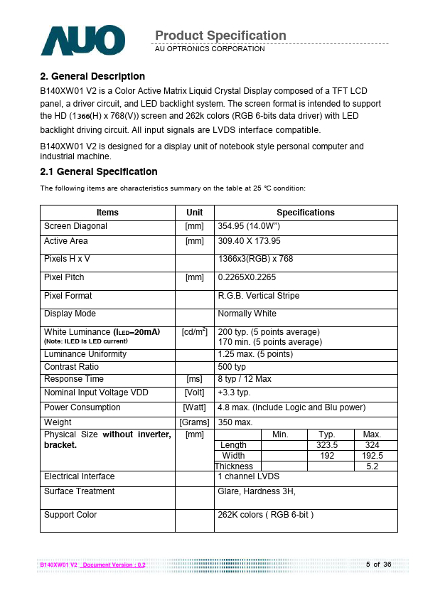 B140XW01 V2 is a Color Active Matrix Liquid Crystal Display posed of a TFT LCD panel, a driver circuit, and LED backlight system. The screen format is intended to support the HD (1366(H) x 768(V)) screen and 262k colors (RGB 6-bits data driver) with LED backlight driving circuit. All input signals are LVDS interface patible.