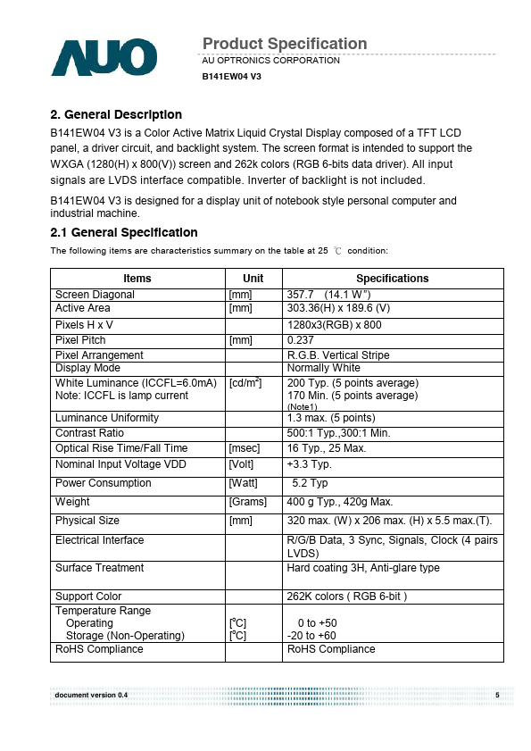 B141EW04 V3 is a Color Active Matrix Liquid Crystal Display posed of a TFT LCD panel, a driver circuit, and backlight system. The screen format is intended to support the WXGA (1280(H) x 800(V)) screen and 262k colors (RGB 6-bits data driver). All input signals are LVDS interface patible.