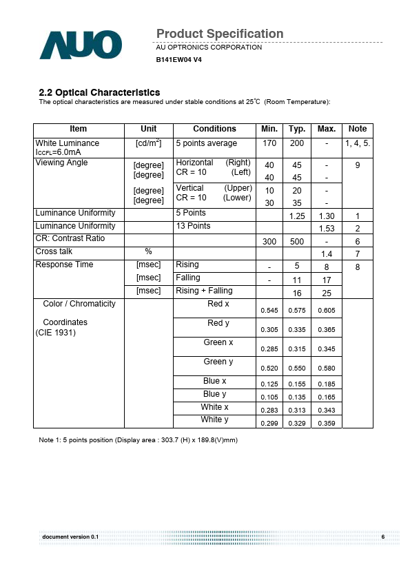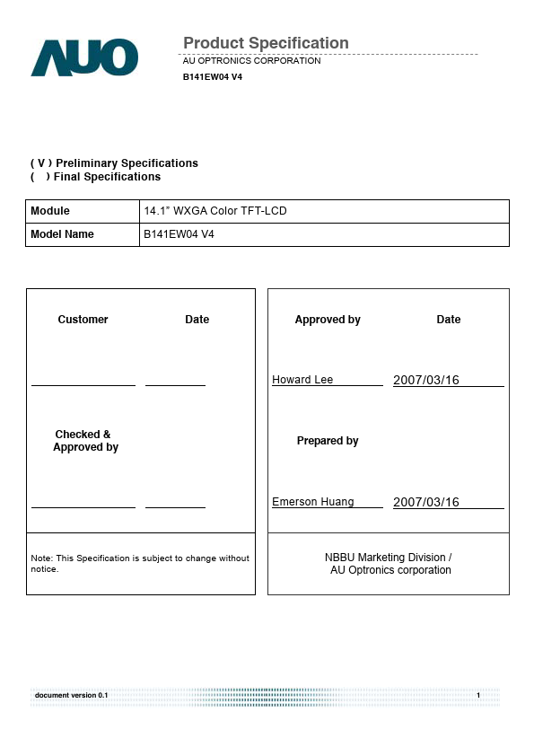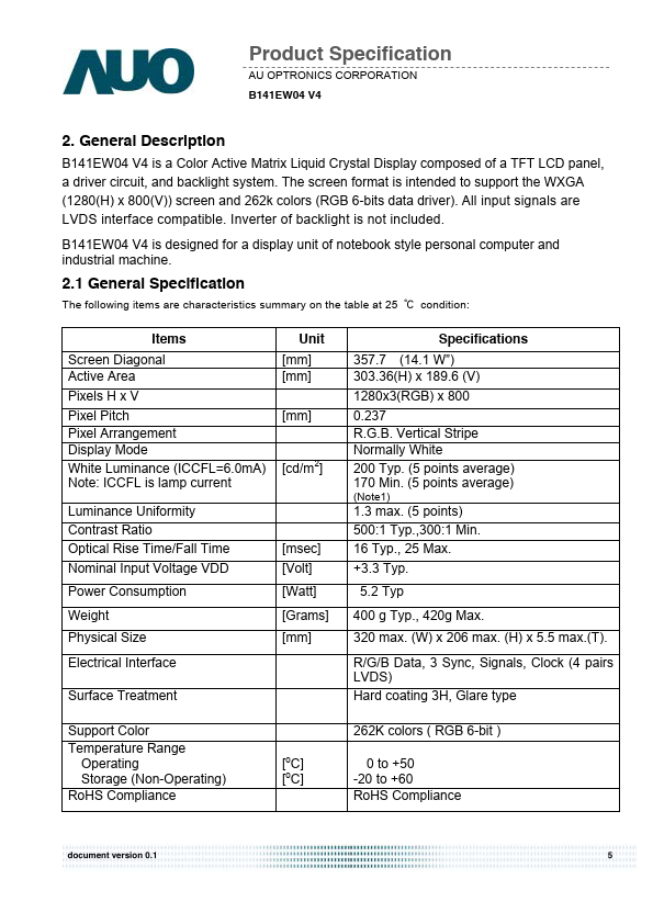 B141EW04 V4 is a Color Active Matrix Liquid Crystal Display posed of a TFT LCD panel, a driver circuit, and backlight system. The screen format is intended to support the WXGA (1280(H) x 800(V)) screen and 262k colors (RGB 6-bits data driver). All input signals are LVDS interface patible.