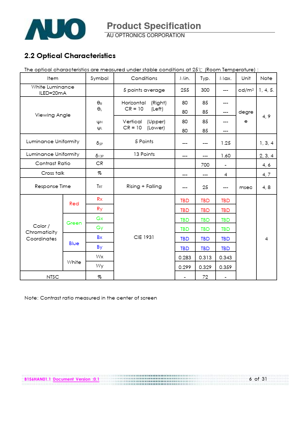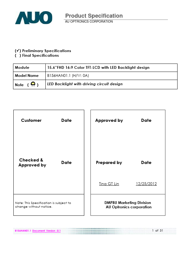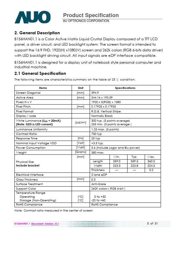 B156HAN01.1 is a Color Active Matrix Liquid Crystal Display posed of a TFT LCD panel, a driver circuit, and LED backlight system. The screen format is intended to support the 16:9 FHD, 1920(H) x1080(V) screen and 262k colors (RGB 6-bits data driver) with LED backlight driving circuit. All input signals are eDP interface patible.