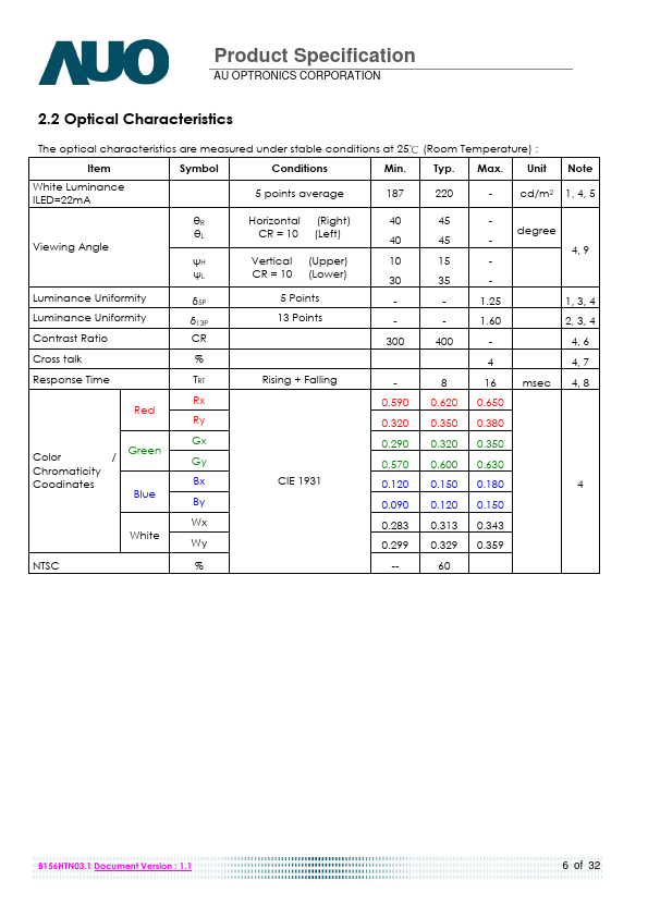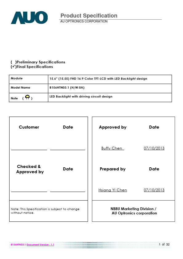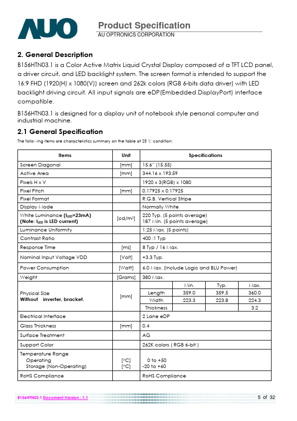 B156HTN03.1 is a Color Active Matrix Liquid Crystal Display posed of a TFT LCD panel, a driver circuit, and LED backlight system. The screen format is intended to support the 16:9 FHD (1920(H) x 1080(V)) screen and 262k colors (RGB 6-bits data driver) with LED backlight driving circuit. All input signals are eDP(Embedded DisplayPort) interface patible.