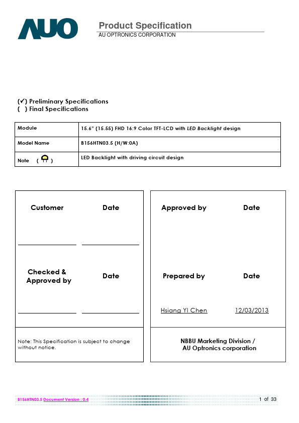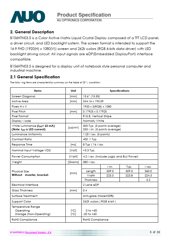 B156HTN03.5 is a Color Active Matrix Liquid Crystal Display posed of a TFT LCD panel, a driver circuit, and LED backlight system. The screen format is intended to support the 16:9 FHD (1920(H) x 1080(V)) screen and 262k colors (RGB 6-bits data driver) with LED backlight driving circuit. All input signals are eDP(Embedded DisplayPort) interface patible.