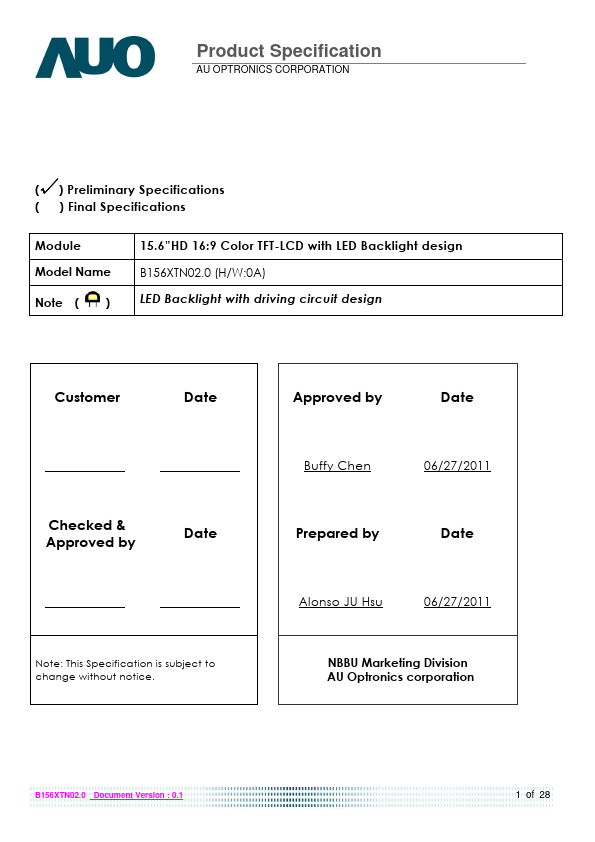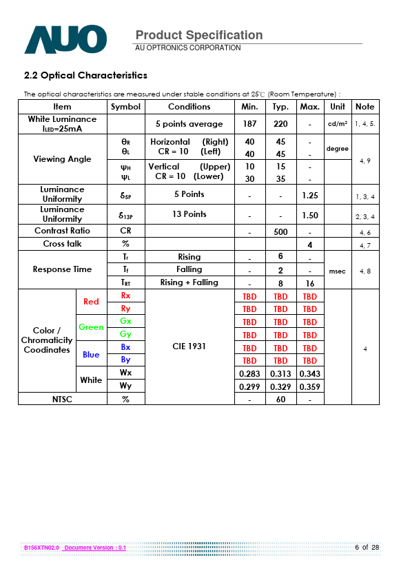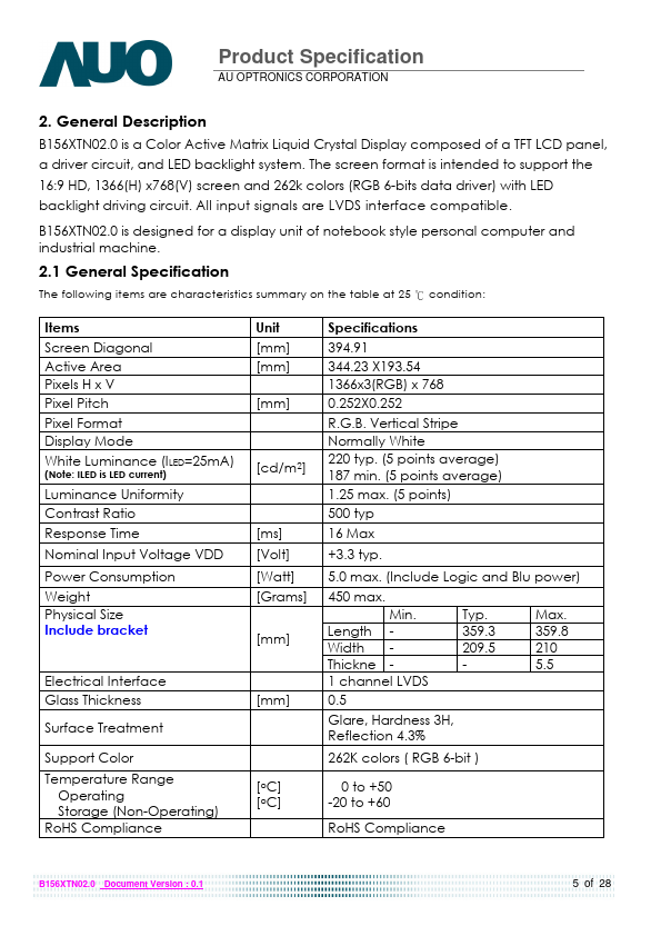 B156XTN02.0 is a Color Active Matrix Liquid Crystal Display posed of a TFT LCD panel, a driver circuit, and LED backlight system. The screen format is intended to support the 16:9 HD, 1366(H) x768(V) screen and 262k colors (RGB 6-bits data driver) with LED backlight driving circuit. All input signals are LVDS interface patible.