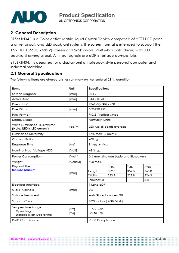 B156XTN04.1 is a Color Active Matrix Liquid Crystal Display posed of a TFT LCD panel, a driver circuit, and LED backlight system. The screen format is intended to support the 16:9 HD, 1366(H) x768(V) screen and 262k colors (RGB 6-bits data driver) with LED backlight driving circuit. All input signals are eDP interface patible.