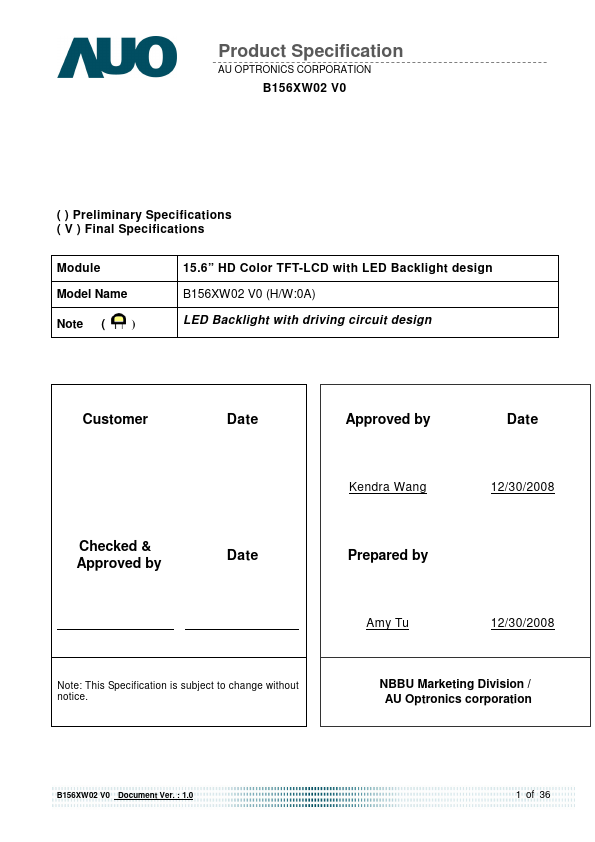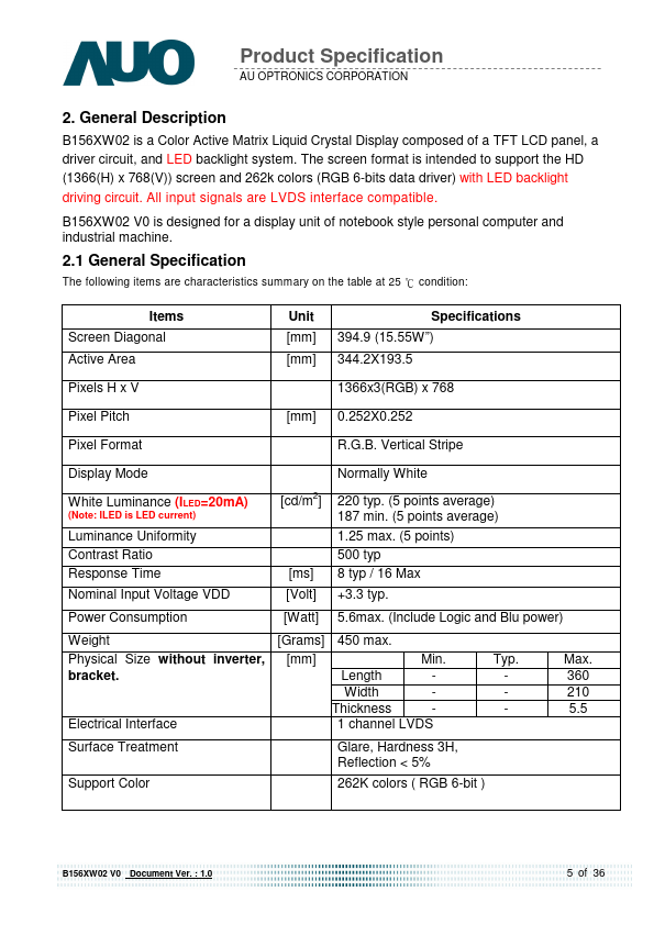 B156XW02 is a Color Active Matrix Liquid Crystal Display posed of a TFT LCD panel, a driver circuit, and LED backlight system. The screen format is intended to support the HD (1366(H) x 768(V)) screen and 262k colors (RGB 6-bits data driver) with LED backlight driving circuit. All input signals are LVDS interface patible.