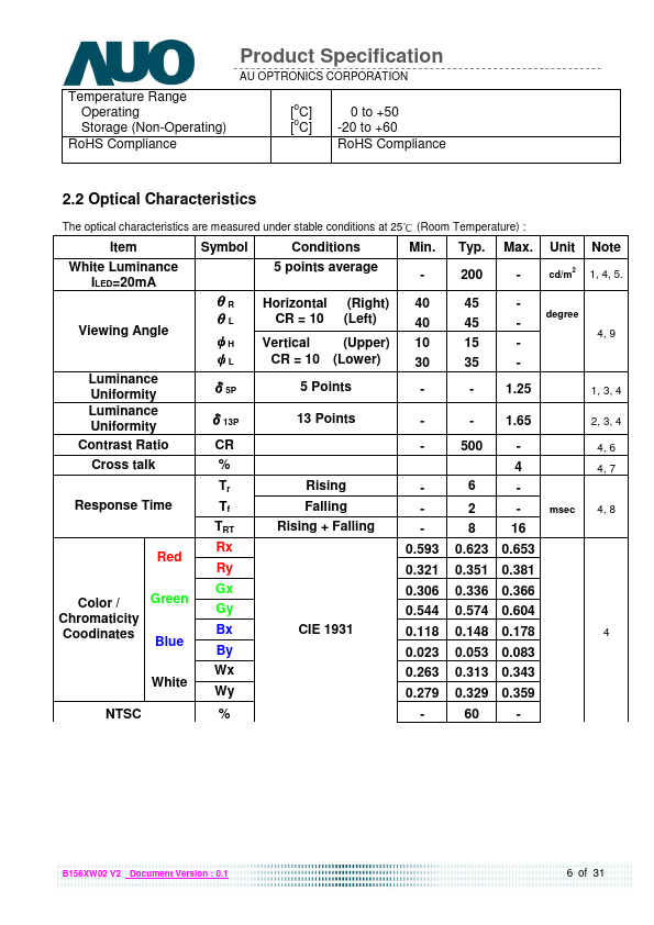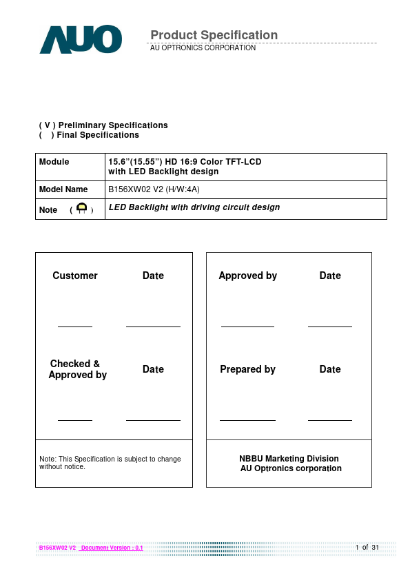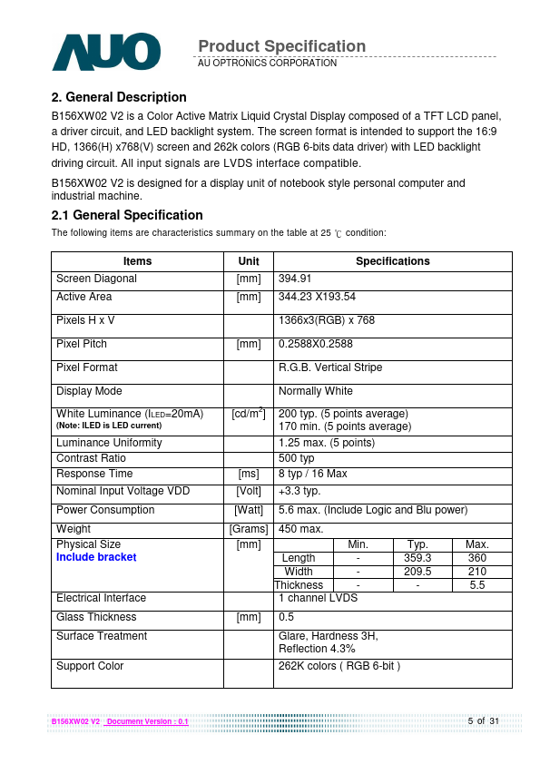 B156XW02 V2 is a Color Active Matrix Liquid Crystal Display posed of a TFT LCD panel, a driver circuit, and LED backlight system. The screen format is intended to support the 16:9 HD, 1366(H) x768(V) screen and 262k colors (RGB 6-bits data driver) with LED backlight driving circuit. All input signals are LVDS interface patible.