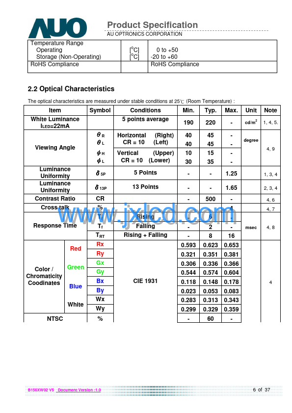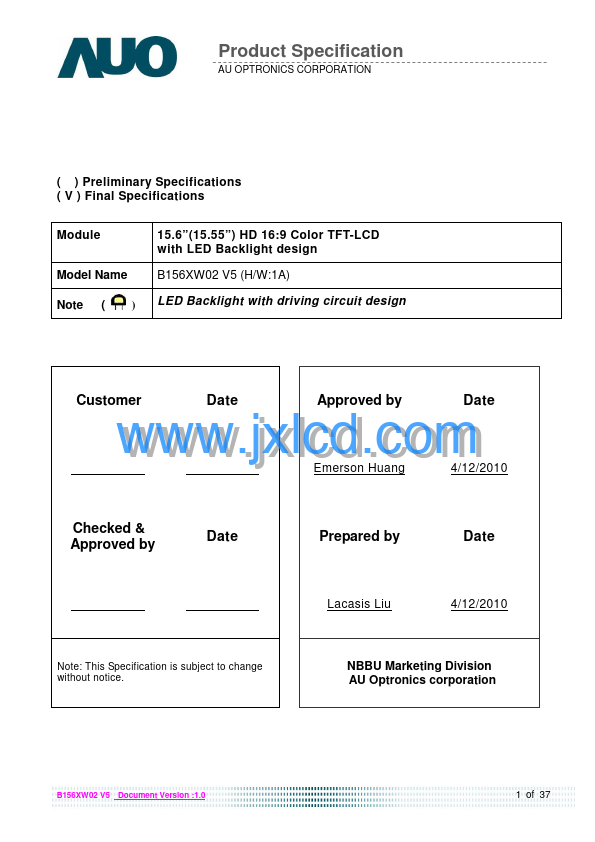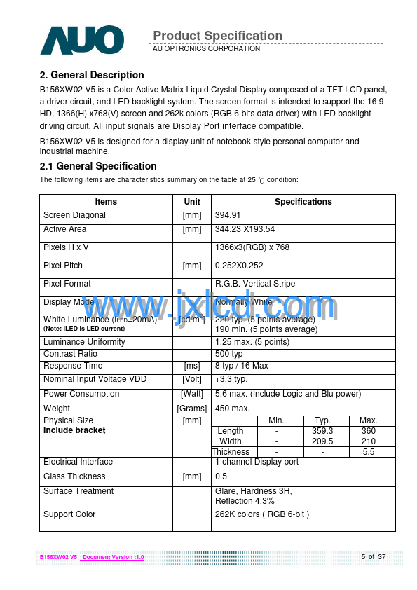 B156XW02 V5 is a Color Active Matrix Liquid Crystal Display posed of a TFT LCD panel, a driver circuit, and LED backlight system. The screen format is intended to support the 16:9 HD, 1366(H) x768(V) screen and 262k colors (RGB 6-bits data driver) with LED backlight driving circuit. All input signals are Display Port interface patible.